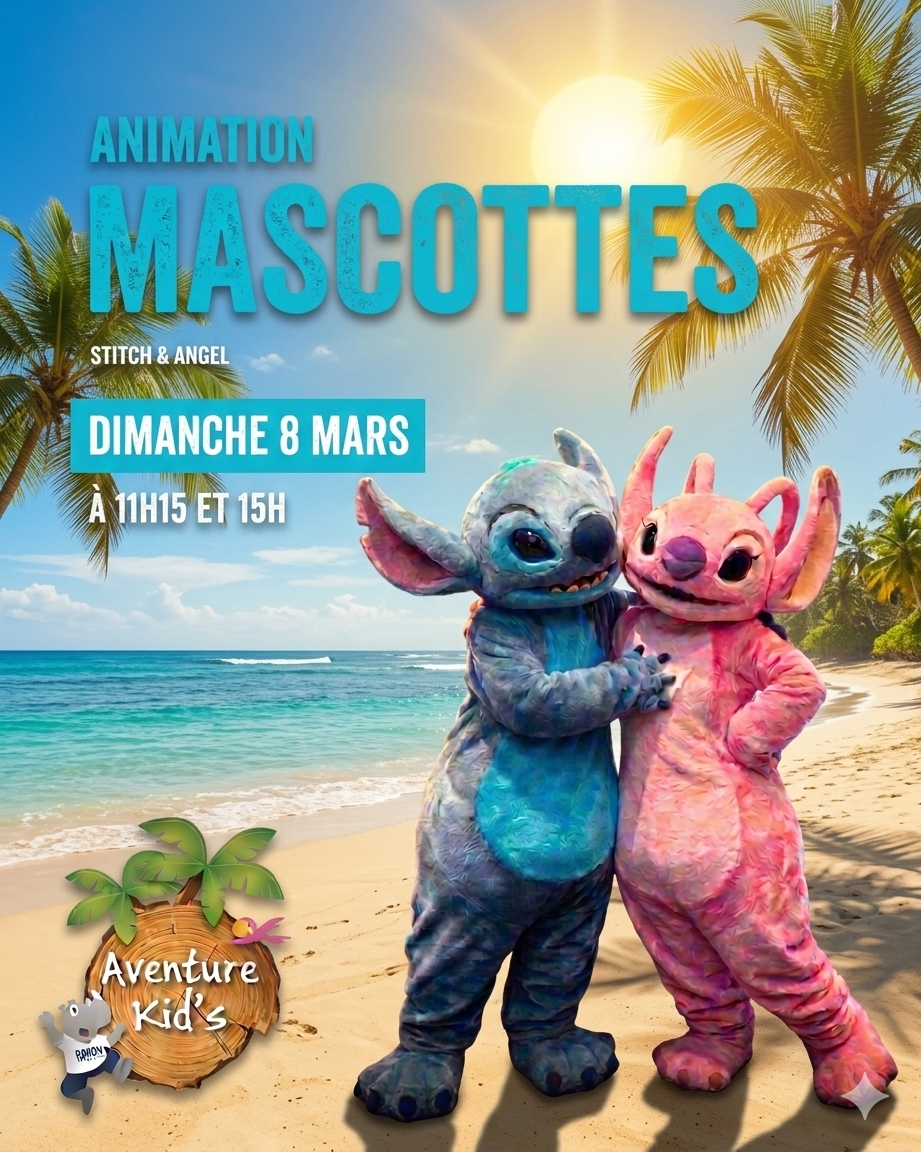 Ce dimanche 8 mars, nos mascottes préférées Stitch & Angel s'échappent de leur île pour venir vous rencontrer chez Aventure Kid's !